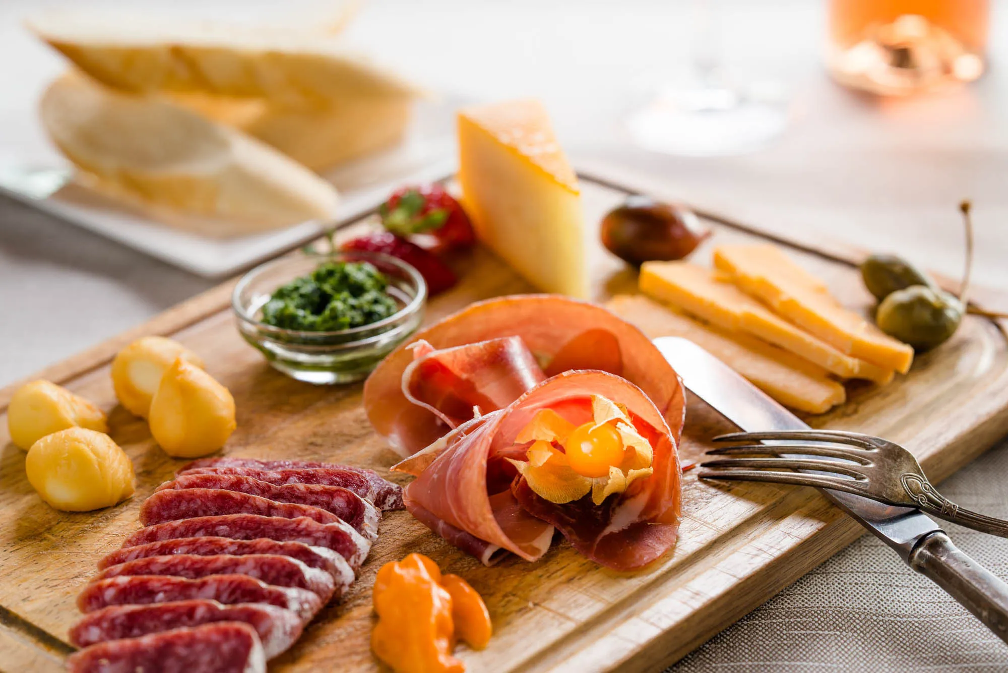 „Carpaccio“ (raw sliced beef with olive oil, parmesan and arugula, toast)