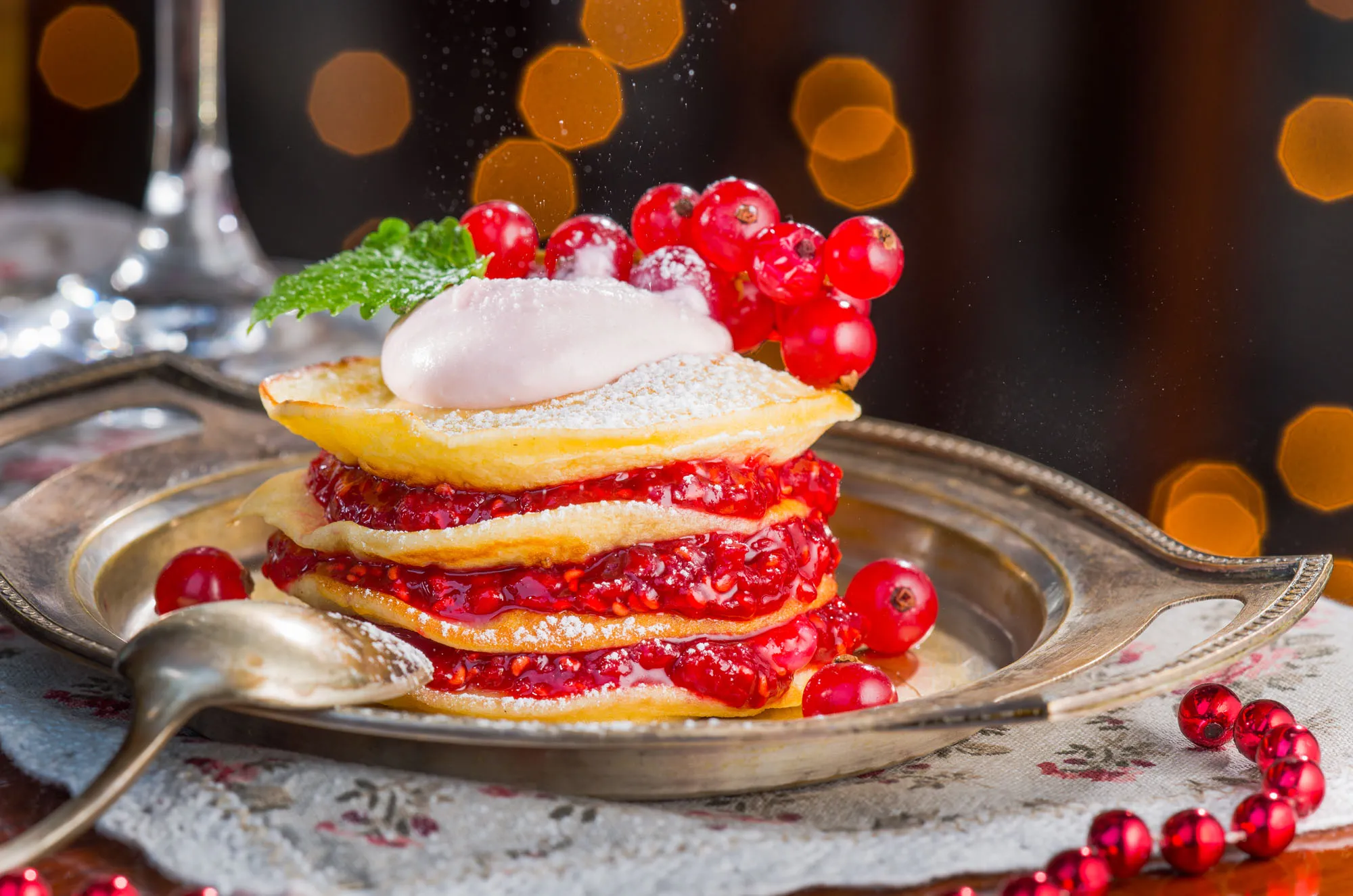 Pancake with jam and ice cream, whipped cream