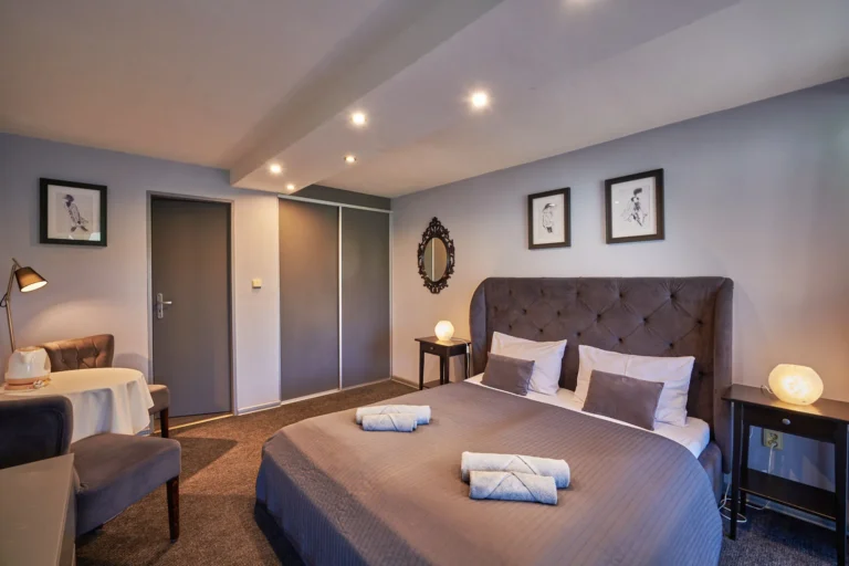 V moderne zariadenej dvojlôžkovej izbe s celopresklenou stenou s výhľadom na historické mesto a Nový zámok je použitá široká paleta odtieňov sivej.