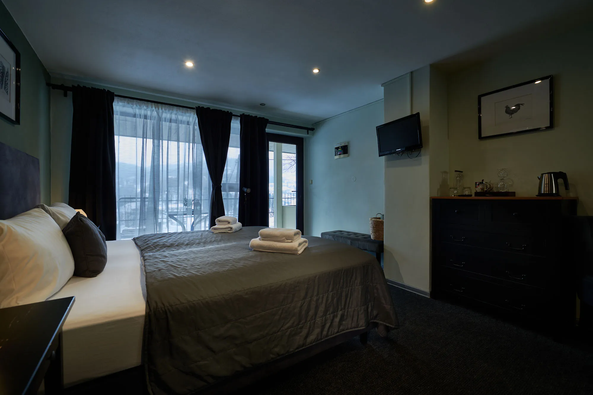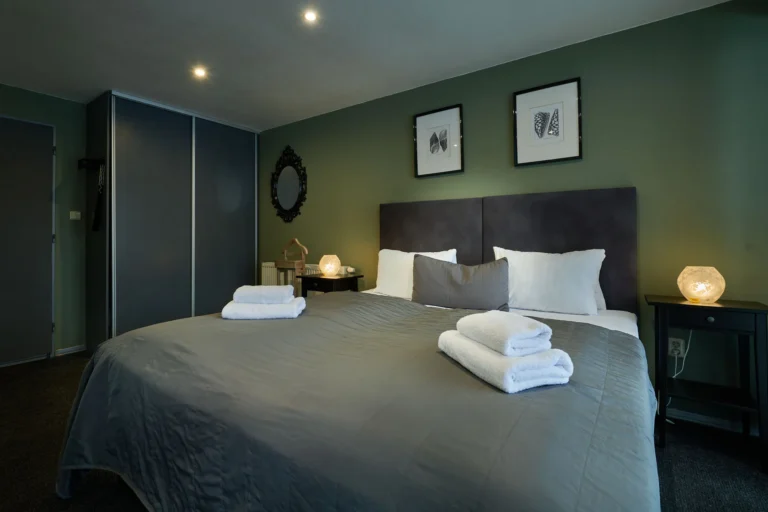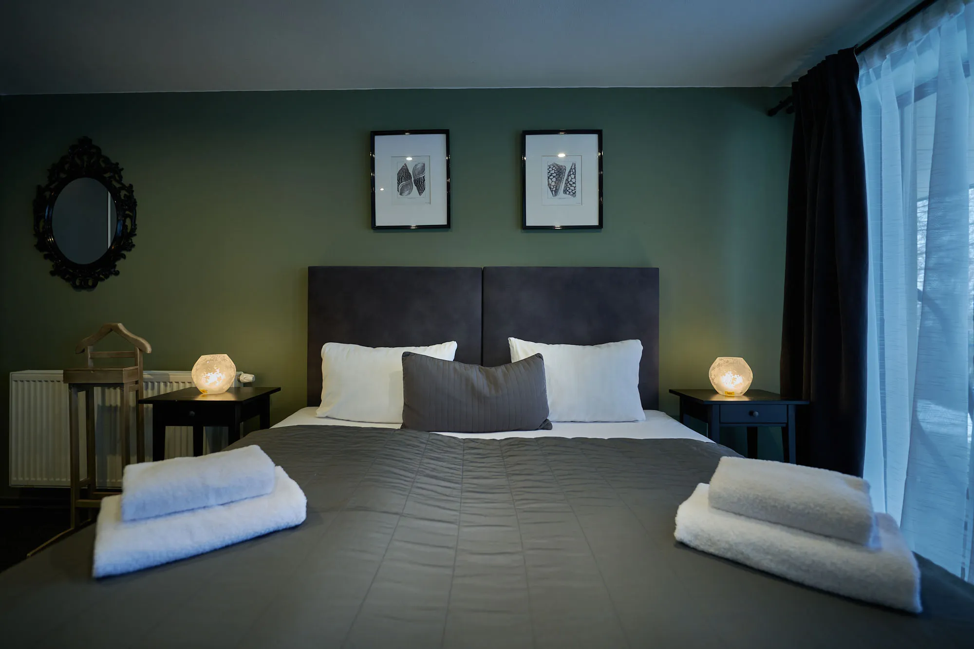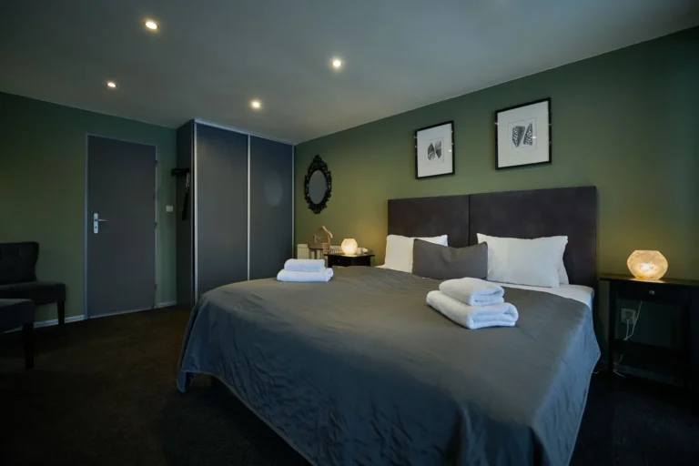 V moderne zariadenej dvojlôžkovej izba s celopresklenou stenou s výhľadom na historické mesto a Nový zámok je použitá široká paleta odtieňov zelenej.