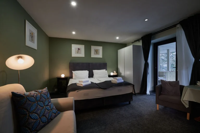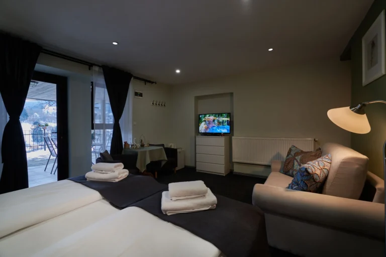 Izba je vybavená manželskou posteľou, rozkladacou sedačkou s výborným matracom (veľmi jednoduchým spôsobom), bez možnosti prístelku, kúpeľňou, wifi free, chladničkou, rýchlovarnou kanvicou, káva, čaj, TV. Vlastné vonkajšie sedenie. Izba má rozlohu 21 m2 a kúpeľňa 3,60 m2.