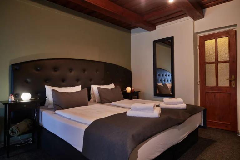Izba je vybavená manželskou posteľou, bez možnosti prístelku, kúpeľňou, wifi free, chladničkou, rýchlovarnou kanvicou, káva, čaj, TV. Vlastné vonkajšie sedenie. Izba má rozlohu 16 m2 a kúpeľňa 5,60 m2.