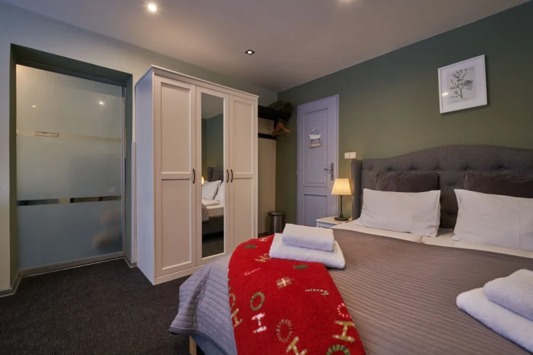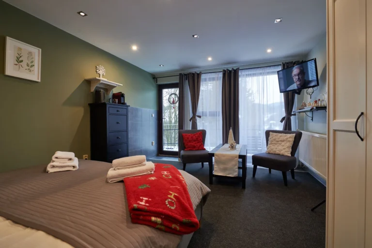 „Family room “ sa skladá z dvoch miestností. V prvej sa nachádza: manželská posteľ 160x200 cm, sedenie s výhľadom, vchod do kúpeľne so sprchovacím kútom.