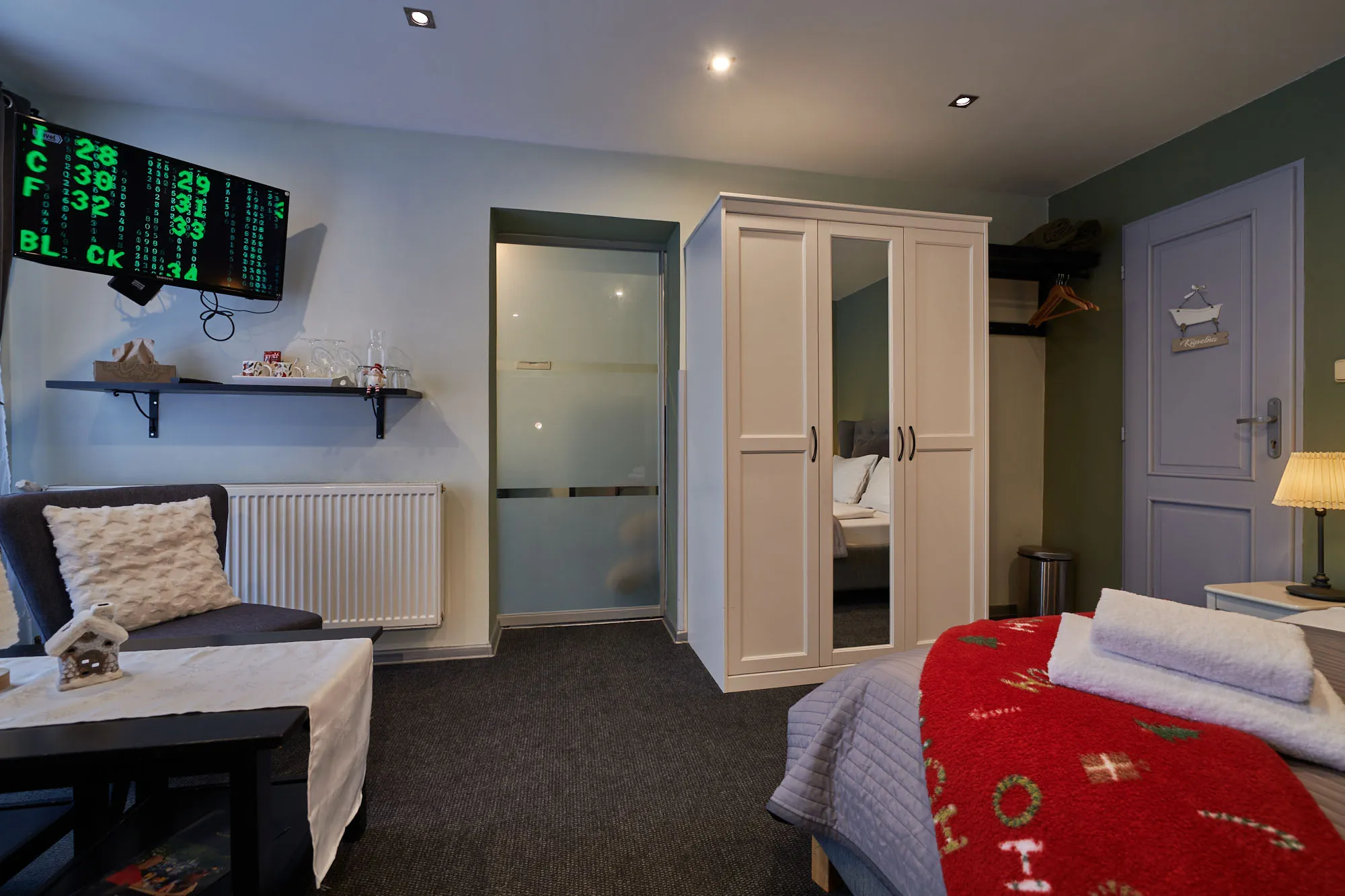 „Family room “ sa skladá z dvoch miestností. V prvej sa nachádza: manželská posteľ 160x200 cm, sedenie s výhľadom, vchod do kúpeľne so sprchovacím kútom.
