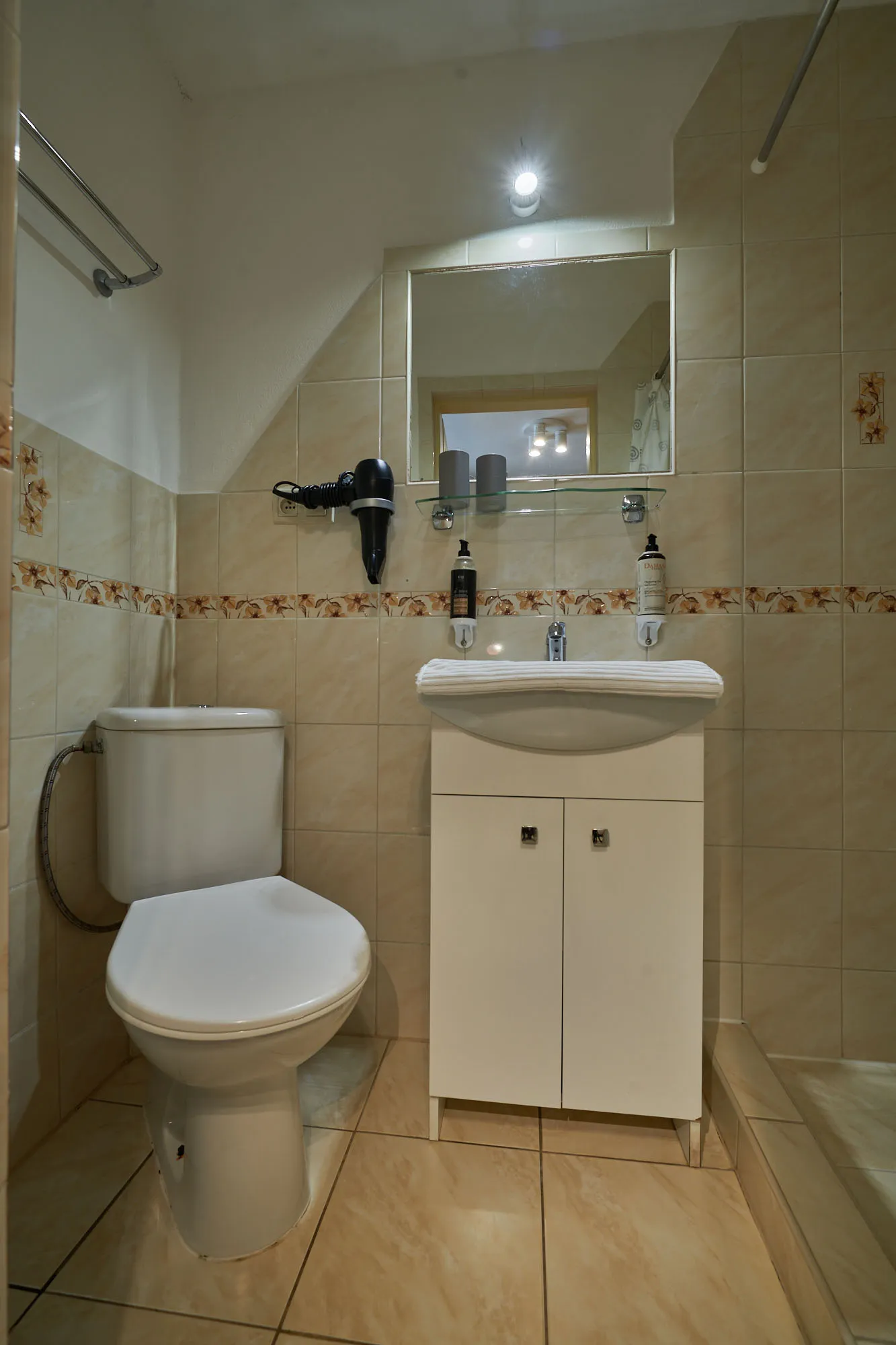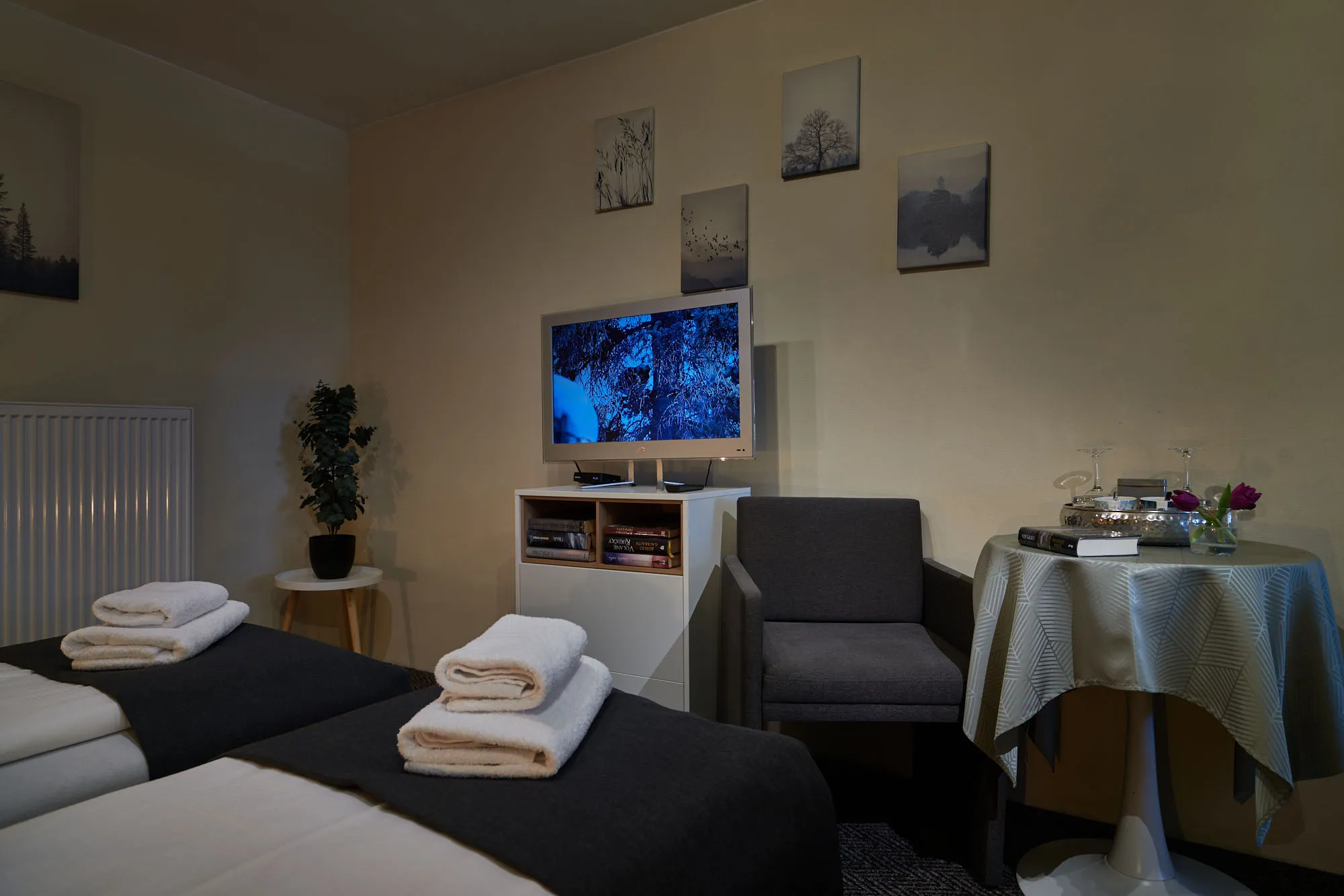 Izba je vybavená posteľami s možnosťou rozloženia, bez možnosti prístelku, kúpeľňou, chladničkou, rýchlovarnou kanvicou, káva, čaj, TV. Izba má rozlohu 20 m2 a kúpeľňa 3,30 m2.