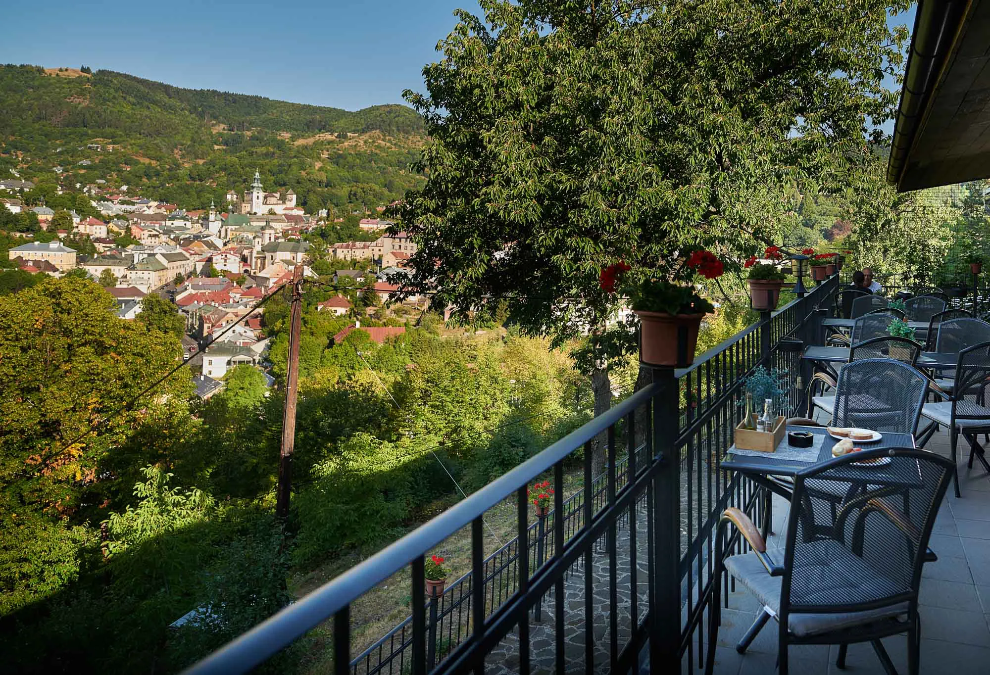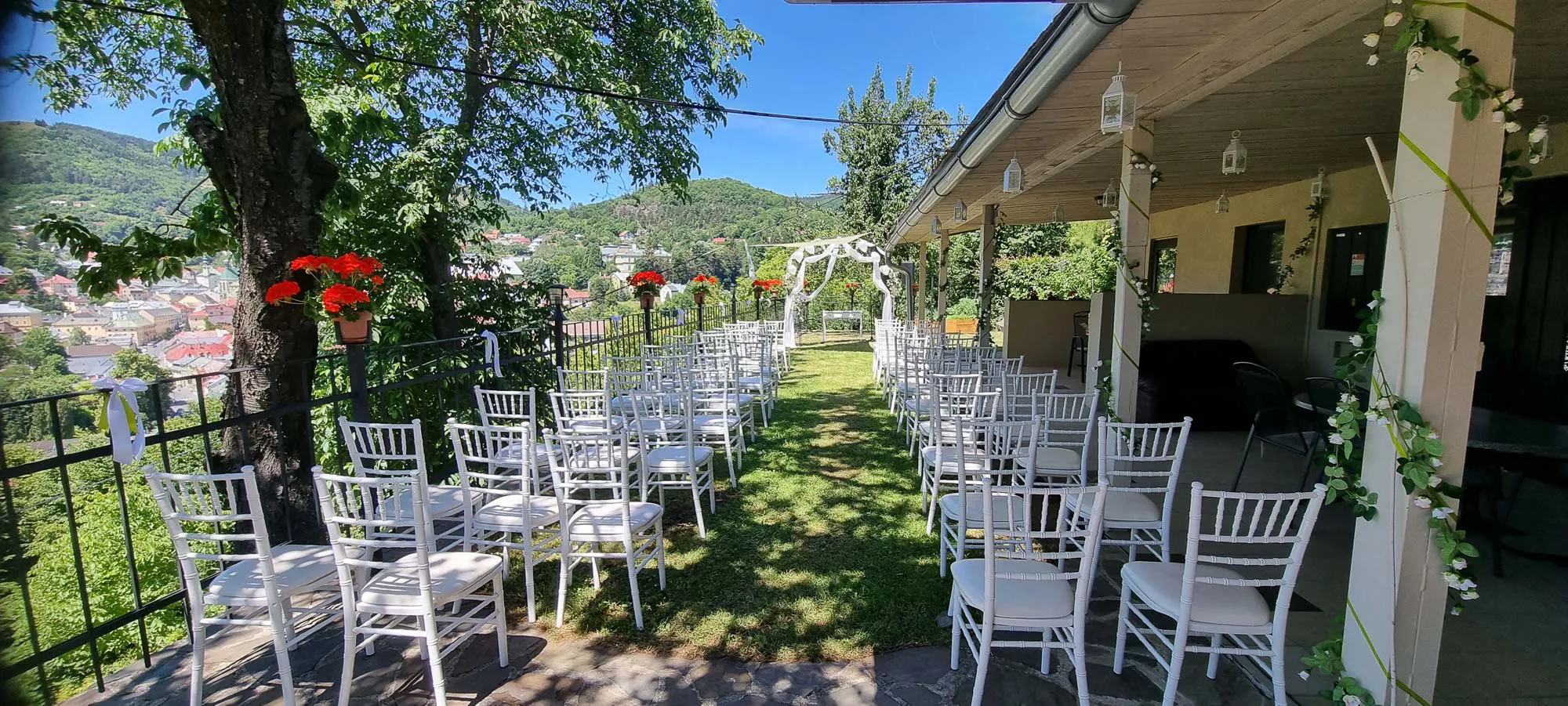- Otvorená terasa: 40 osôb, s nádherným výhľadom na historické centrum Banskej Štiavnice